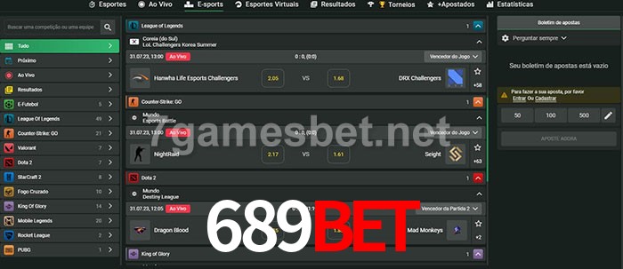 O 689Bet oferece uma grande seleção de opções de apostas em e-sports com probabilidades competitivas